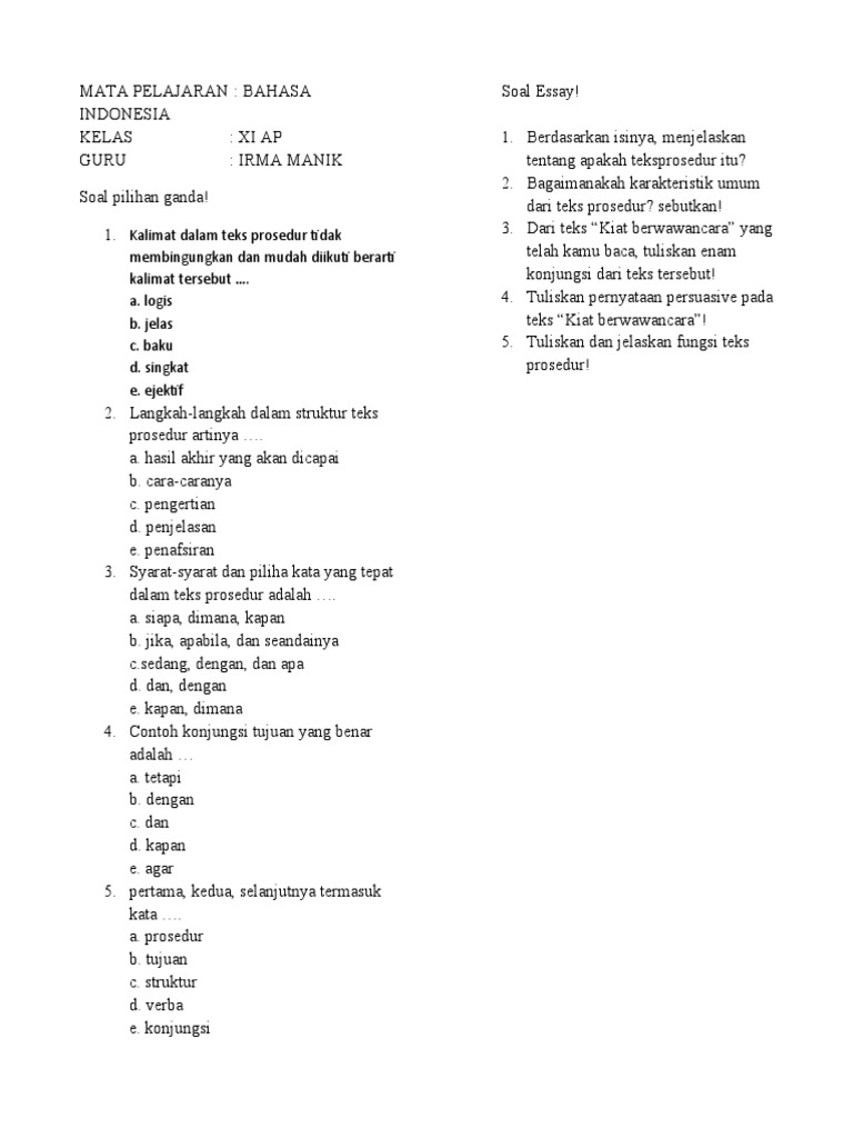 Soal Essay Bahasa Indonesia Kelas 11 Tentang Teks Prosedur - Soal Uts Pts Bahasa Indonesia Kelas Xi Sma Ma Kurikulum 2013 Semester 1 Tahun Pelajaran 2018 2019 Zuhri Indonesia : Berdasarkan penyebab terjadinya, gempa bumi dapat digolongkan menajdi 2, yaitu gempa tektonik dan gempa vulkanik.. Soal pilihan ganda kd 3.1 1. Soal ini tentang materi pelajaran bahasa indonesia kelas 7 yaitu teks prosedur. (teks berikut digunakan untuk menjawab soal nomor 8‑10)(1) yakinkan calon pemberi dana bahwa bekerja sama dalam bentuk pemberian dana dari. Indonesia kelas 12 semester 1 tentang membangun opini ini bisa dijadikan referensi belajar online mata pelajaran b. Apa yang harus diketahui dalam mengidentifikasi informasi dalam teks eksplanasi?